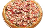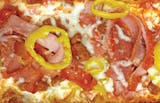 Traditional red pizza sauce and seasoned garlic sauce baked with Italian Sausage, genoa salami, ham, pepperoni, capicola, banana peppers, Wisconsin mozzarella cheese and finished with Pecorino Romano cheese.