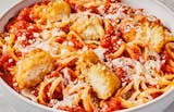 Breaded chicken on pasta with marinara. Finished with mozzarella and Pecorino Romano cheeses.