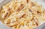 A bed of pasta and grilled chicken strips in alfredo sauce and finished with Pecorino Romano cheese.