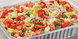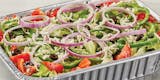 Serves 12-16. Fresh greens with red onions, roasted red peppers, black olives, tomatoes and banana peppers. Finished with feta and Pecorino Romano cheeses.