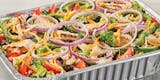 Serves 12-16. Grilled chicken with fresh greens, red onions, green peppers, black olives and tomatoes. Sprinkled with mozzarella, cheddar and Pecorino Romano cheeses.